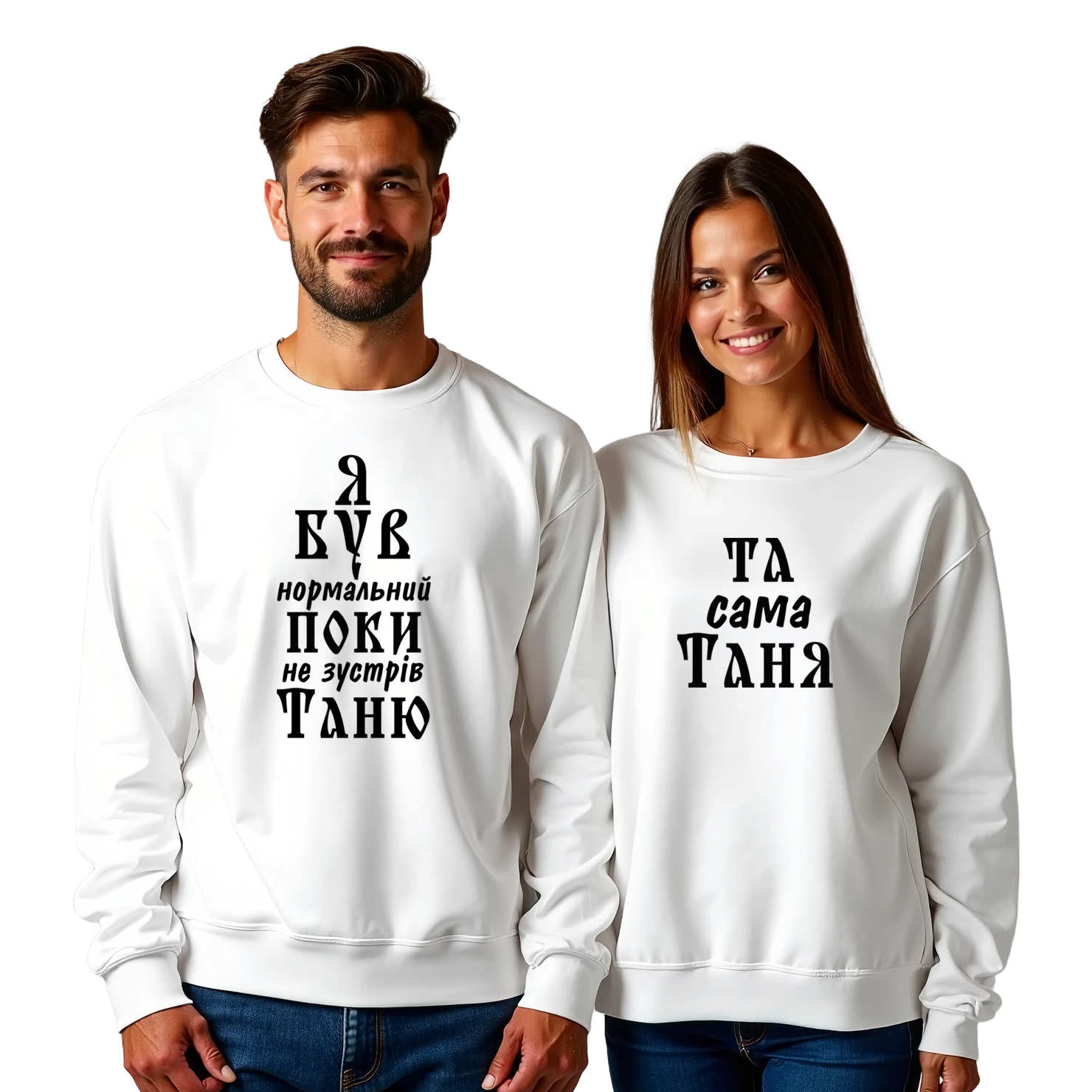 Парні світшоти “Я був нормальний” — це той випадок, коли любов і здоровий глузд ідуть різними дорогами. Ну серйозно: ще вчора він був “адекватний чоловік”, а сьогодні гордо носить напис «Я був нормальний поки не зустрів Таню». І поруч — «та сама Таня», яка усміхається так, ніби це взагалі його ідея.