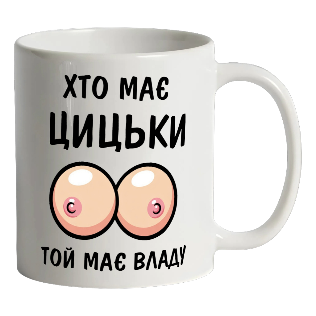 Біла кружка “хто має цицьки той має владу” ідеально заходить для дому, роботи або навіть як “тихий тролінг” в офісі. Поставила на стіл — і вже атмосфера інша. Хтось читає, хтось перепитує, хтось зависає. А ти просто п’єш каву і кайфуєш.
