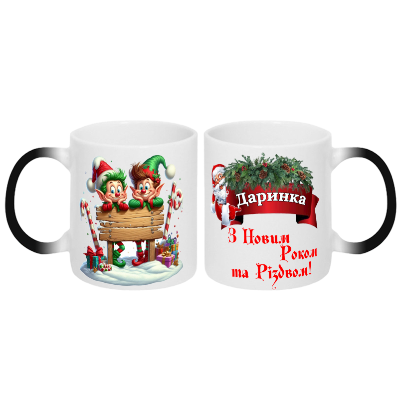 Хамелеонні чашки особливо люблять ті, хто цінує несподівані ефекти. Вони підходять як для дорослих, так і для дітей, бо момент проявлення зображення завжди викликає щиру реакцію. Це ідеальний варіант, коли хочеться здивувати, але без пафосу. Ім’я додає індивідуальності, а новорічні мотиви створюють атмосферу свята вже з першого ковтка. Такі чашки часто замовляють для колективів, шкіл та дитячих груп — кожен отримує свій варіант, але всі разом виглядають гармонійно.