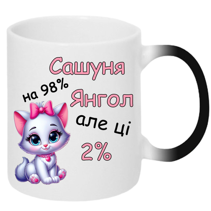 Чашка хамелеон — це вже сама по собі цікава річ. Вона змінює вигляд залежно від температури напою, і саме цей ефект робить її улюбленицею багатьох. А коли до цього додається фраза “Сашуня на 98% янгол, але ці 2%” — результат просто бездоганний.