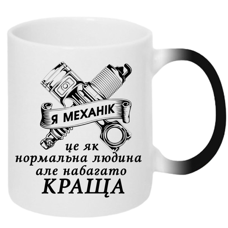 Звичайна чорна на вигляд чашка перетворюється на стильний аксесуар, коли ви наливаєте в неї каву чи чай. На очах проявляється напис “Я механік”, і світ одразу стає трішки чеснішим. Адже всі знають: без механіка жодна машина, трактор чи навіть пральна машинка не поїде й не запрацює.
