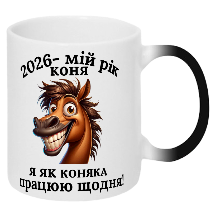 Коли ранки починаються не з романтики, а з думки «ну працюю я як коняка, і що тепер?», саме чашка хамелеон Я як коняка додає трішки гумору і мотивує пережити ще один день цього марафону під назвою «доросле життя». Зовні вона здається звичайною — стримана, темна, навіть трохи загадкова. Та варто налити всередину гарячого — і на очах з’являється яскравий напис, який без зайвих слів пояснює ваш стан світу. І так, з легким підтекстом: «я тягну все, як той кінь, але ви мене недооцінюєте».