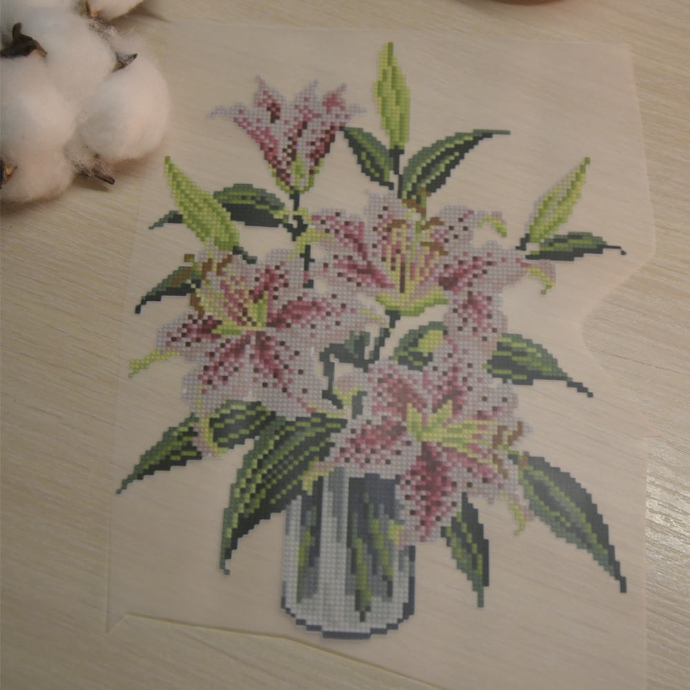 DTF принт “Лілії у вазі”: стильна імітація вишивки — це поєднання традиційної декоративної естетики з сучасною технологією цифрового друку. Зображення відтворює характерну текстуру стібків, плавні переходи та рельєфність, що асоціюються з ручною вишивкою. Завдяки цьому композиція виглядає глибокою, структурованою та професійно виконаною.