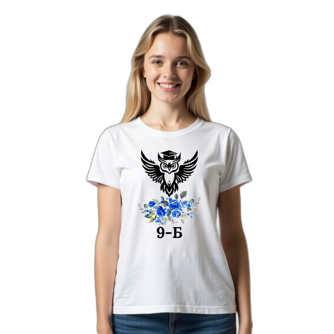 На футболці зображена сова в академічній шапці — символ розуму, дорослішання і переходу в новий етап. Під нею ніжні сині квіти, які додають балансу і роблять дизайн не сухим, а живим. А головне — тут можна замовити напис під будь-який клас від 1 до 11.