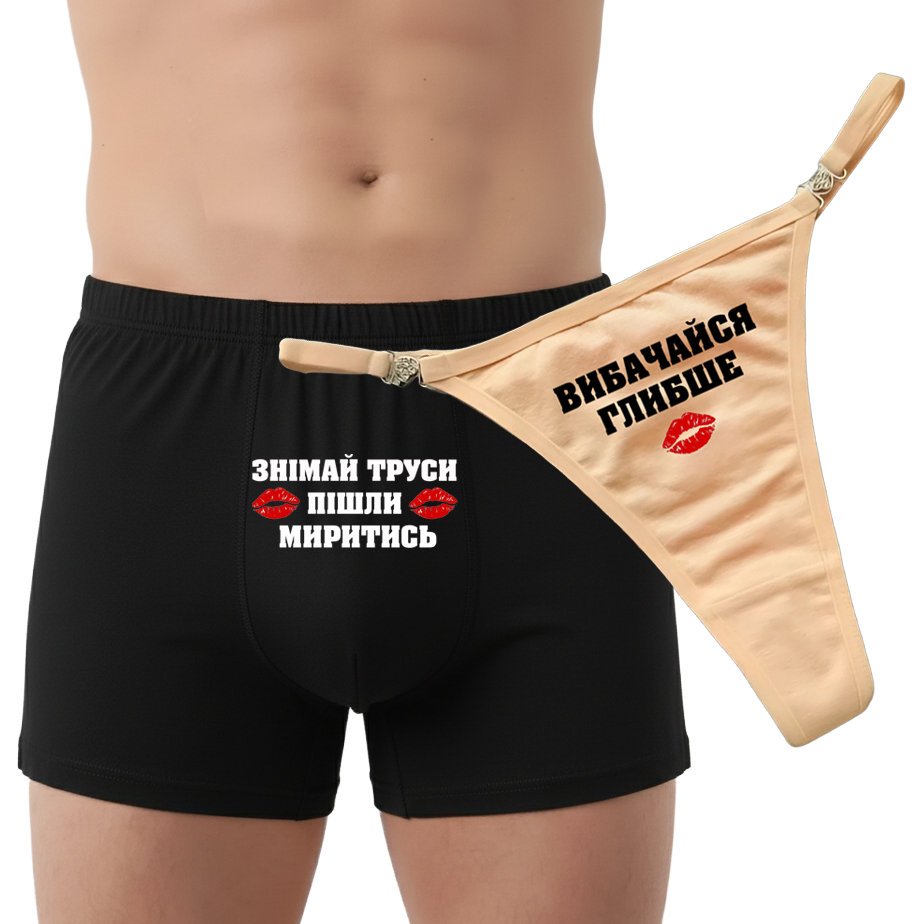 Давай чесно: сварки — це відстій, але примирення після них — це найкраща частина стосунків. Якщо ви знову не поділили, чия черга мити посуд або хто з’їв останній шматочок піци, просто мовчки переодягнись. Цей комплект скаже все за тебе, причому зробить це з таким рівнем харизми, що сердитися далі буде просто фізично неможливо. Парна білизна “Знімай труси пішли миритись” – це не просто шматки тканини, це твій тактичний хід у грі під назвою «щасливе спільне життя».