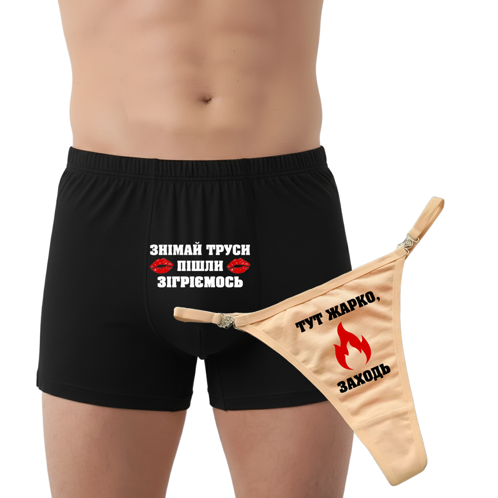 Парна білизна “знімай труси пішли зігріємось” стане топовим подарунком на будь-яку дату: день народження, річницю або навіть просто п’ятницю. Уяви реакцію своєї половинки – ну як? Майбутні емоції варті того щоб придбати? Не зволікай – поки інші купують нудні чашки, бери те, що реально розігріє ваші стосунки. Сплатити за товар можете будь-яким зручним методом – ми приймаємо оплату як банківською карткою так і на рахунок ФОП. Доставка Новою Поштою або Укрпоштою. Якщо у Вас виникнуть додаткові запитання, можете задавати їх в коментарях, на нашій сторінці у Фейсбук або по телефону – наш менеджер із задоволенням проконсультує.