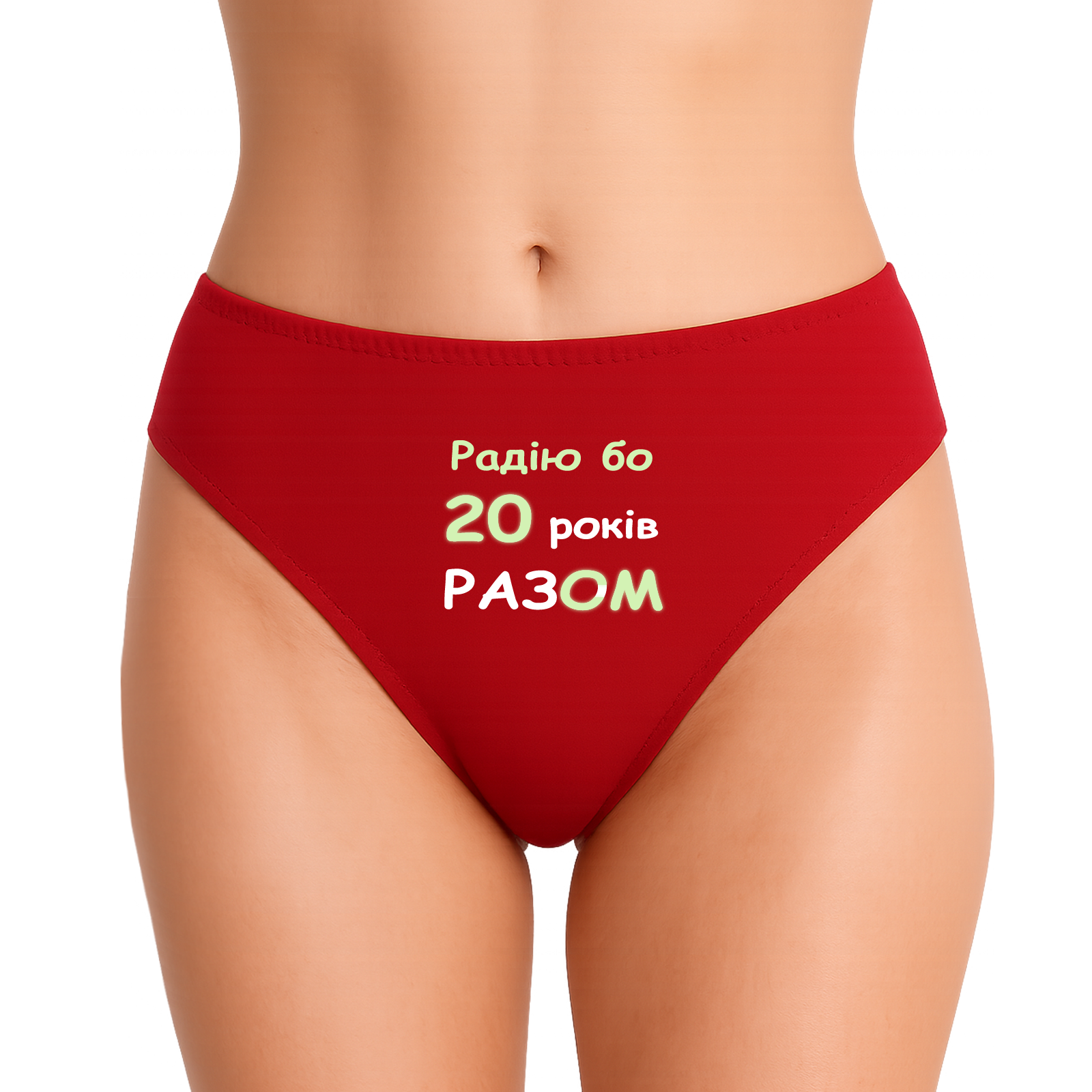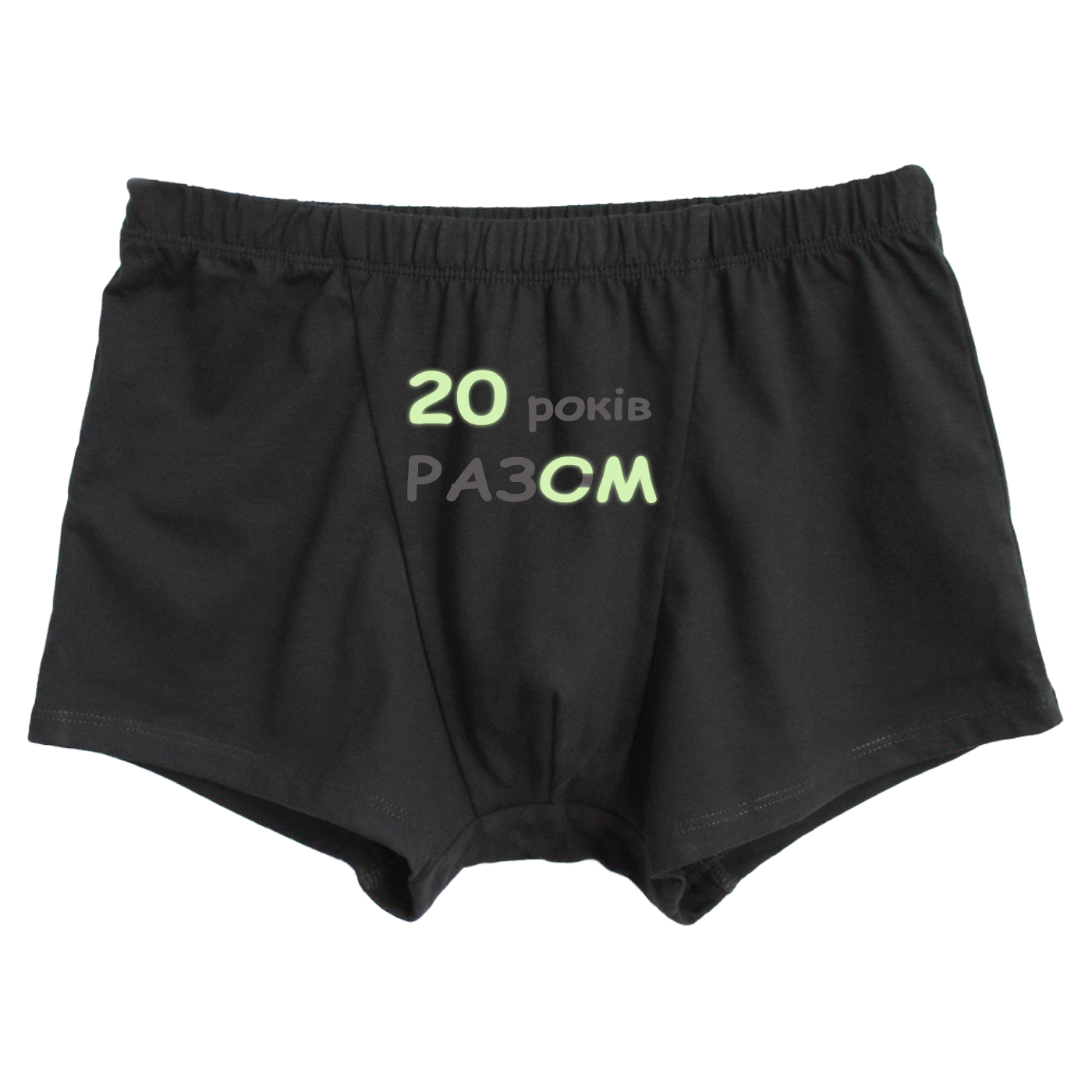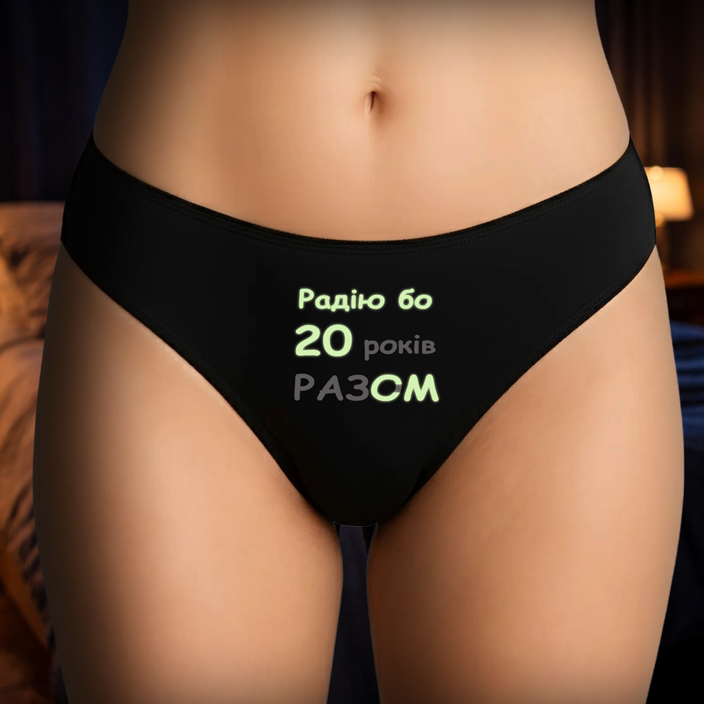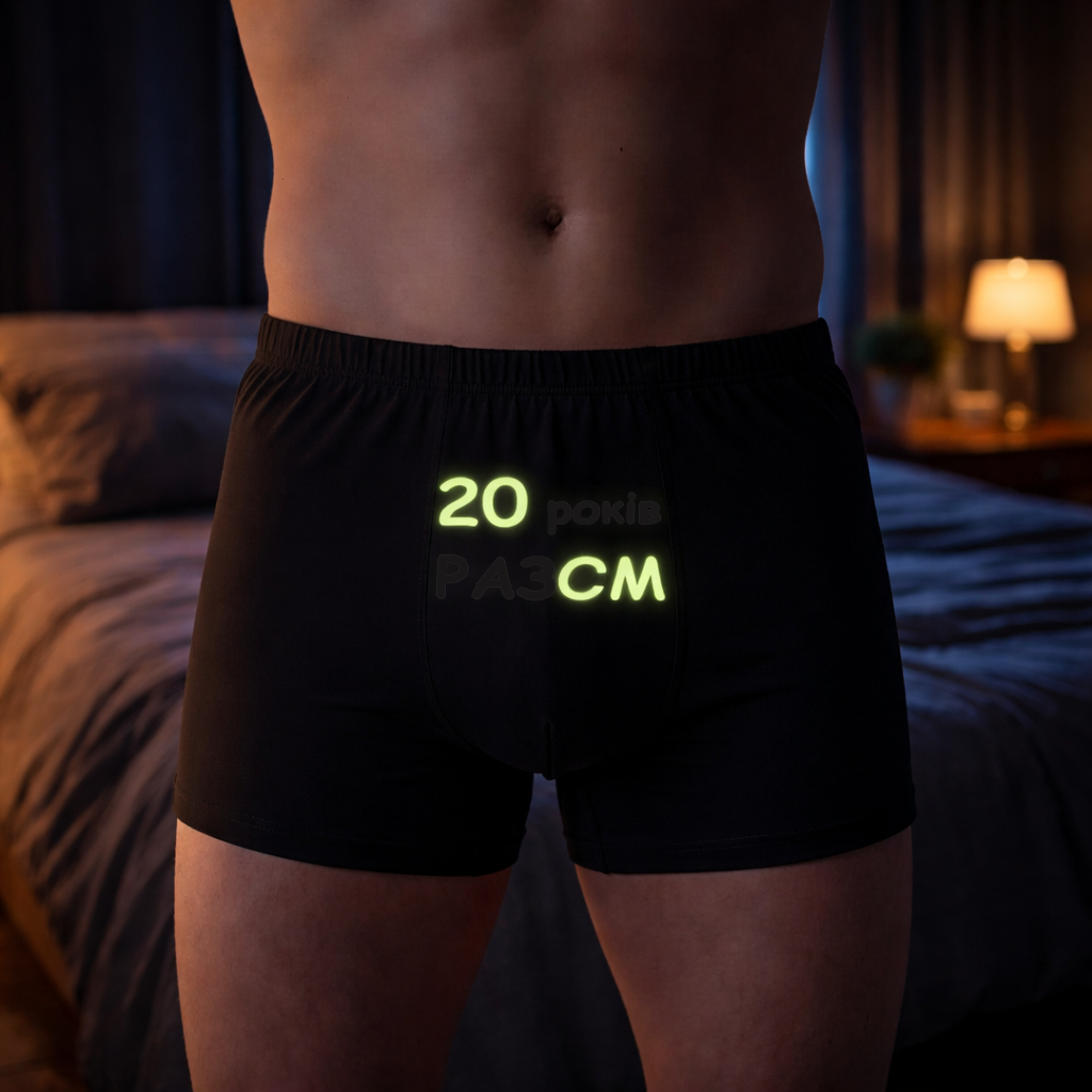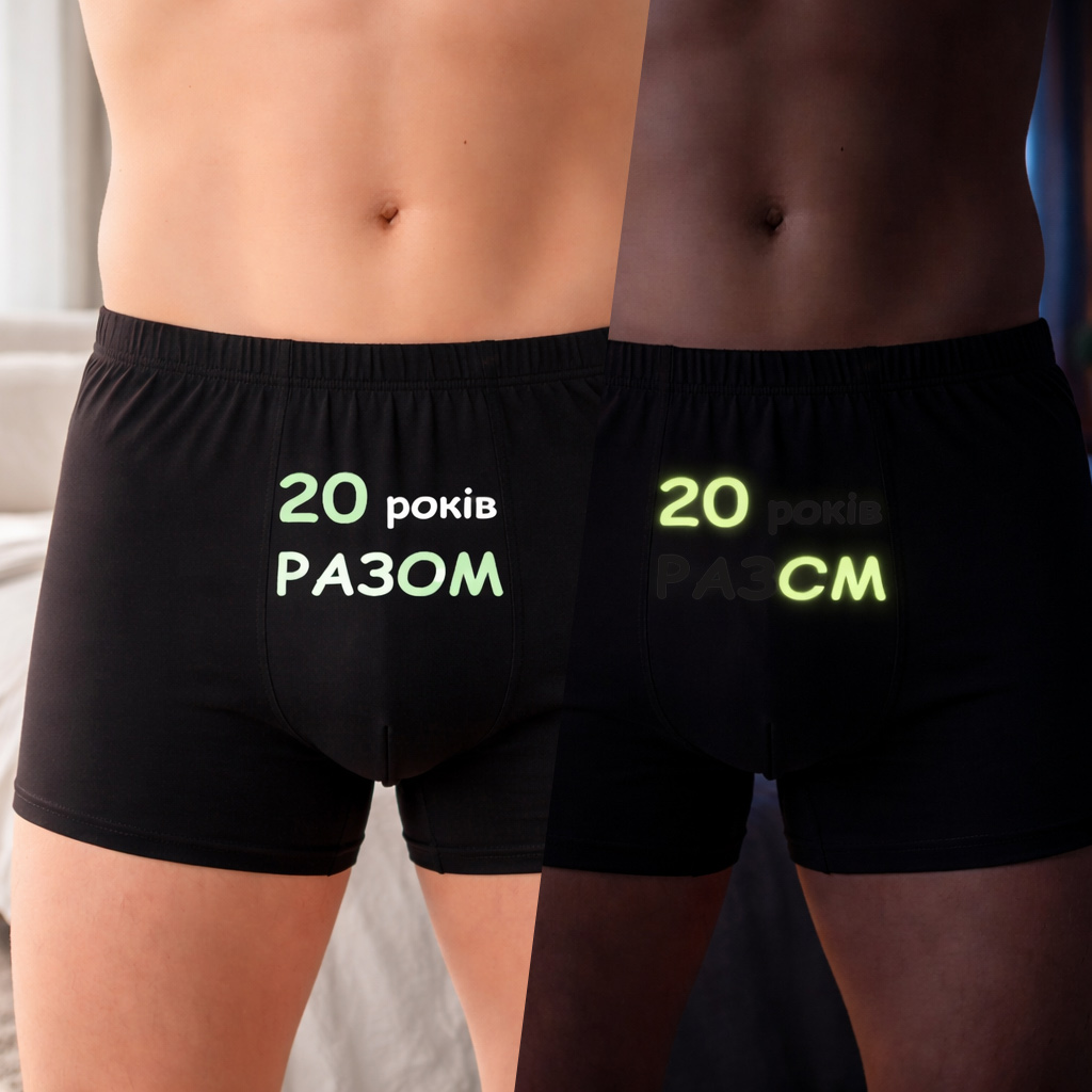 У чому суть приколу? Вдень, при світлі сонця чи люстри, це виглядає як милий, сентиментальний подарунок на річницю. На чоловічих написано “20 років РАЗОМ”, на жіночих — “Радію бо 20 років РАЗОМ”. Теща бачать — теща плачє від розчулення, яка ви міцна пара. Але варто вимкнути світло… Магія (і трохи фізики) вступає в дію. Частина літер зникає у темряві, а спеціальна люмінесцентна плівка залишає світитися лише найголовніше: “20 СМ” у нього і “Радію бо 20 СМ” у неї. Це той момент, коли романтика переходить у площину “дорослих ігор”. Це зухвало, це смішно і це точно підніме (кхм, настрій) вам обом.
