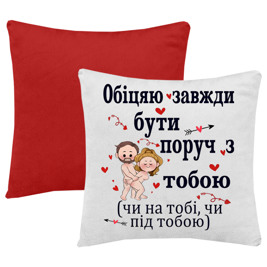 Слухай, якщо ти шукаєш подарунок, який спочатку викличе щиру сльозу розчулення, а через секунду — вибух сміху, то ти щойно його знайшов. Подушка “обіцяю завжди бути поруч з тобою” створена для пар, у яких все гаразд із почуттям гумору і які не бояться додавати перчинки у свої романтичні вечори. На перший погляд це максимально мила річ, така собі ванільна хмаринка для інтер’єру. Але варто підійти ближче або перевернути її, як відкривається вся правда життя: «чи на тобі, чи під тобою». Це і є справжня відданість, хіба ні?