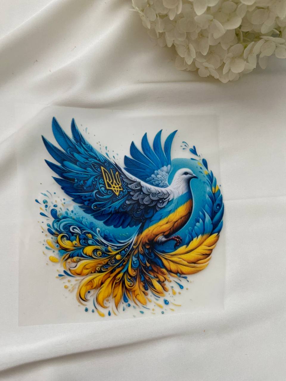 Термоналіпка Голуб миру виготовлена з якісної термоплівки, яку можна переносити на будь-яку бавовняну чи змішану тканину. Якщо хочеш оновити стару улюблену річ — просто приклей голуба на груди або плече. Якщо створюєш щось з нуля — він чудово виглядає і на спині, і на кишені, і навіть на шопері.