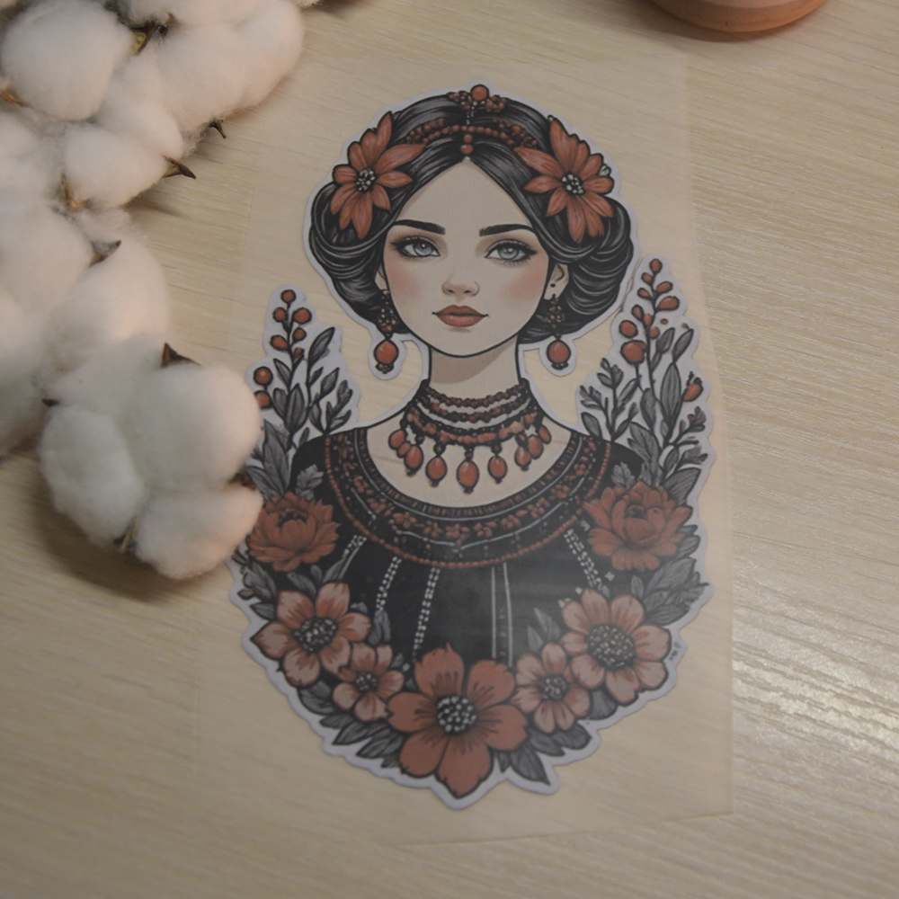 Завдяки технології DTF зображення переноситься на тканину з високою точністю. Контури залишаються чіткими, дрібні квіткові деталі добре опрацьованими, а поверхня принта — гнучкою та комфортною у носінні. Наліпка не створює зайвої щільності в зоні нанесення та не впливає на еластичність матеріалу. Її можна використовувати для футболок, худі, світшотів, шоперів, рюкзаків та інших текстильних виробів.