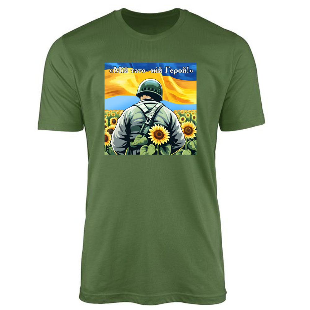 Соняшник — символ сонця, життя та незламності українців. Він завжди повертається до світла, навіть коли довкола темрява. І саме тому зображення цих квітів поруч із написом “Мій тато — мій герой” набуває особливого сенсу. Це не просто декор — це історія, яку можна носити з гордістю.