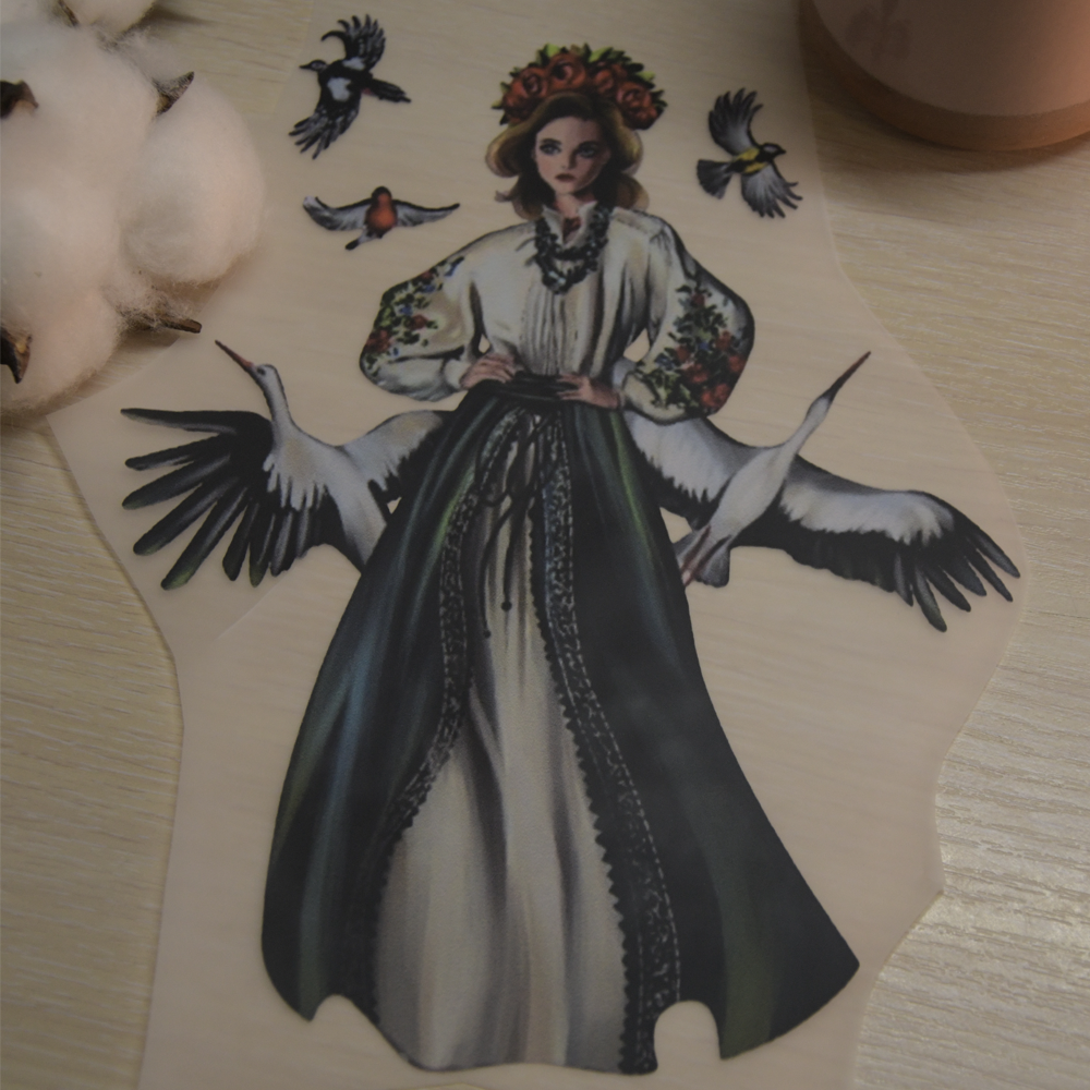 Термоналіпка на одяг «Українська Берегиня» — це сучасний текстильний декор із глибоким символічним змістом. Образ берегині в українській традиції асоціюється з захистом, силою та духовною стійкістю. У поєднанні з сучасною графічною подачею він формує виразний, але стриманий візуальний акцент, що гармонійно доповнює повсякденний гардероб.